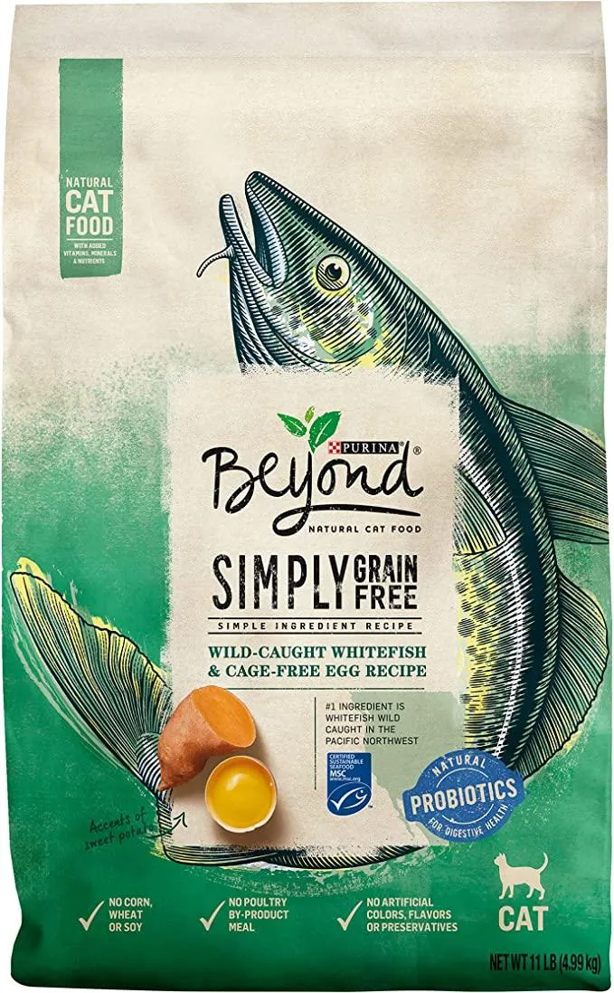 Add flavor, variety, hydration and protein to your cat's diet by feeding her just as nature intended with Purina Beyond Simply Grain Free Wild-Caught Whitefish and Cage-Free Egg Recipe Natural adult dry cat food with added vitamins, minerals and nutrients. Like you, we know the power of looking to nature for our food. Our pet nutritionist selects high-quality, recognizable ingredients from our trusted sources for this simple ingredient cat food kibble to help support your cat's long, healthy life by your side. The high protein cat food formula has real wild-caught whitefish as the number 1 ingredient, and we round out the gluten free cat food recipe with purposeful ingredients, including cage-free egg and accents of sweet potato, to help your cat thrive. Plus, we include natural probiotics for cats to support her digestive health. Our natural cat food kibble with added vitamins, minerals and nutrients gives your adult cat the 100 percent complete and balanced nutrition she needs to be her best.