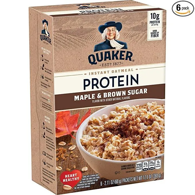 Start your morning with Quaker Protein Oatmeal, which provides a good source of protein per serving through a combination of our nutritious oats, whey protein, and nuts.